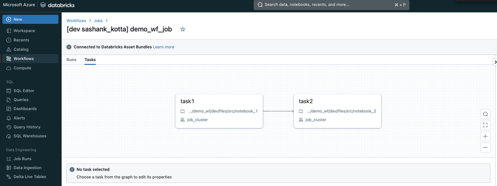 - Inside the resources folder, we will have a YAML file (<project_name>_job.yml, i.e. demo_wf_job.yml) to define the task flow—sample task flow shown below.