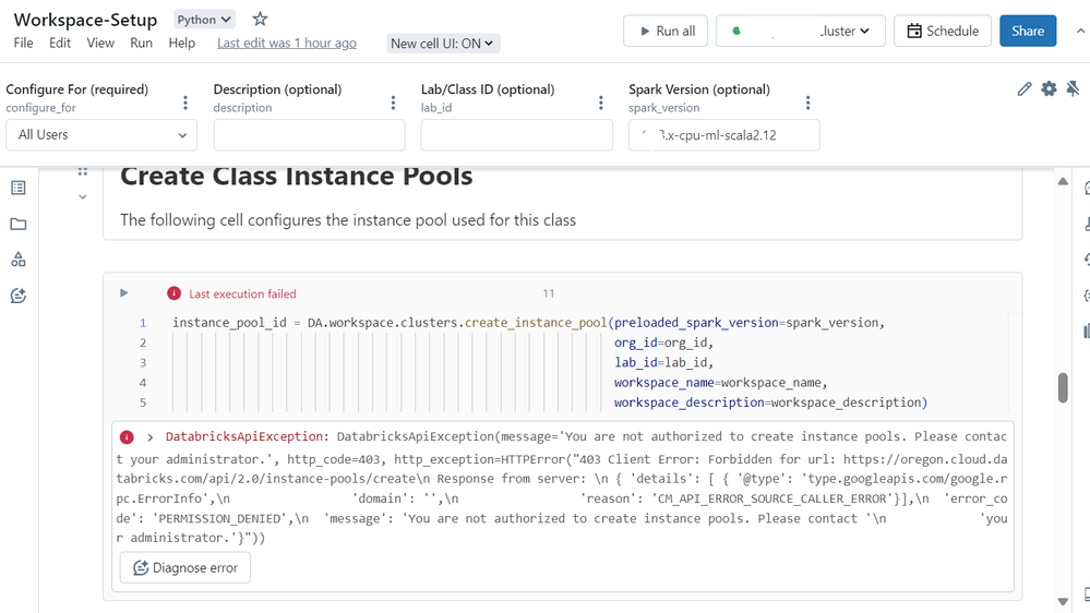 I am taking Data Engineering Associate course on the Databricks Partner Academy. To create pipeline for DLT, the cluster policy DBAcademy DLT is needed. I read from the previous community forums that "/Users/<YOUR USER NAME>/Data Engineering with Databricks - v3.1.4/Includes/Workspace-Setup" to be executed to create the policy. (Reference : Missing 'DBAcademy DLT' as a Cluster Policy when c... - Databricks - 48859). But, when I execute this, I am getting "Permission denied" error while creating instance pool. The screenshot is attached. Please suggest on how I can proceed further with the hands on exercises.