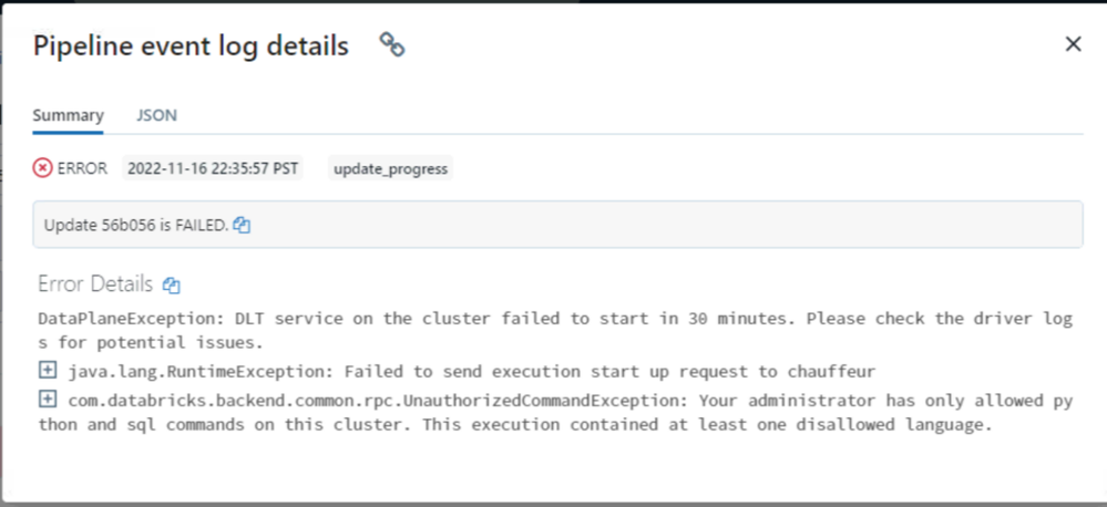 Hi @Arumugam Ramachandranโ seems like you have a spark config set on your DLT job cluster that allows only python and SQL code. Check the spark config (cluster policy).