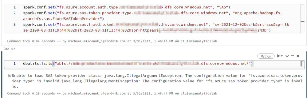 Hi, I am trying to connect to the Storage Account using the SAS token, and receive this error: Unable to load SAS token provider class: java.lang.IllegalArgumentException - more on the picture.