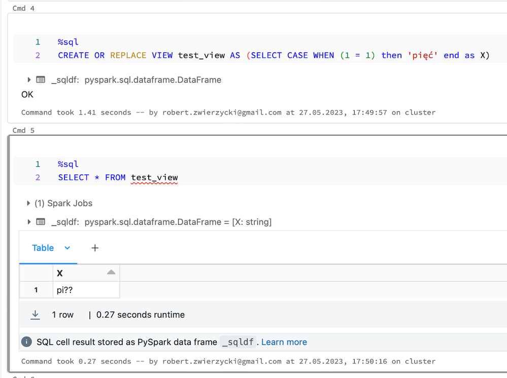 I've tried to create a view with a simple conditional statement containing Polish characters. The view is created without errors, but select on the view returns question marks in place of the non-ASCII characters. Why? How to fix it?