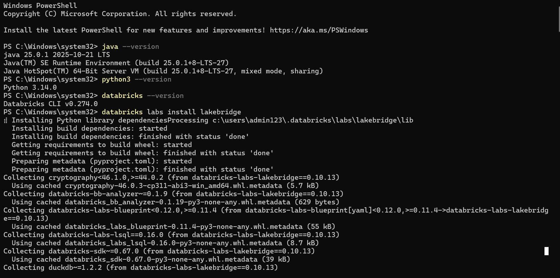 I’m reaching out for assistance with installing Databricks Lakebridge on my organization laptop. I have confirmed the stated prerequisites are installed: Java 22+, Python 3.11+, and the latest Databricks CLI, but the installer fails to complete. I also attempted the installation from an Azure VM as an alternative, and that attempt failed as well.