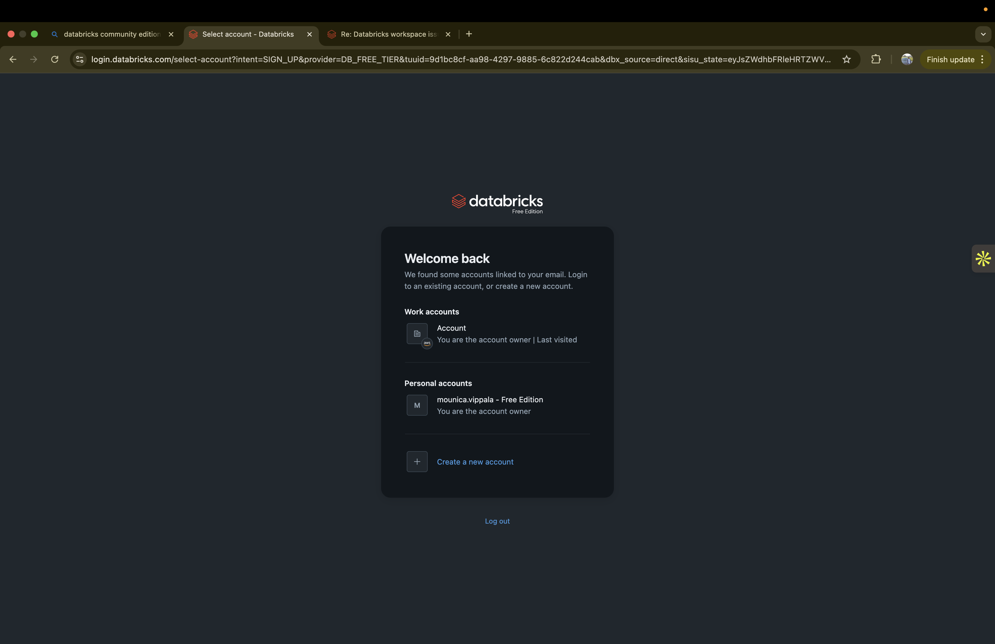 The good news is that you have already confirmed the solution by creating a new Databricks Free Edition account that works correctly. Free Edition is the replacement for Community Edition and includes a number of capabilities that were not available in Community Edition, including: