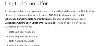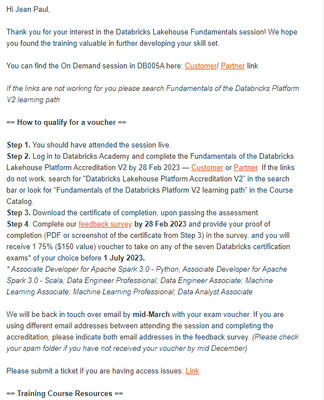 Hello team,I have cleared the Completed the Databricks Lakehouse fundamentals accreditation and received confirmation email and certificate as well.As per one of Databricks recent promotion, one could get voucher worth $150 if the user has valid Lake...