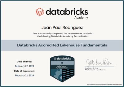 Hi Databricks, I have attended Databricks webinar "The Best Data Engineering Platform is a Lakehouse" on 1st of February 2023. I have completed Fundamentals of the Databricks Lakehouse Platform Accreditation version 1 and Fundamentals of the Databric...