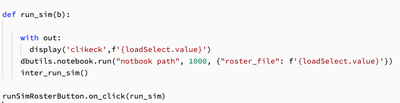 I am trying to add a button in a notebook to trigger an execution of another notebook, but it does not respond to the command. Any idea why? The run command works if I run in a separate cell