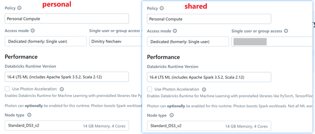 This is personal vs shared clusters configuration, I don't get what is making them to work differently.