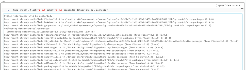 1. To begin, we will first install the necessary dependencies: We will be using Flask framework to create a shareable application and geopandas to create a world map as a visualization (optional), also we will be using databricks-sql-connector for fetching data from Delta tables.