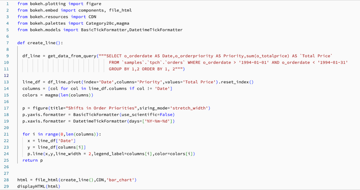 In conclusion, Bokeh is a versatile and effective Python framework to create interactive visualizations for data exploration, analysis, and communication. Due to its user-friendly design and numerous customization possibilities, it can be an excellent tool for both new and expert users. It is a great tool for making charts that can be shared and incorporated in websites or applications due to its scalability and web friendliness. Users can quickly and easily generate complex visualizations at scale by utilising Databricks' distributed computing capabilities. They can also streamline their data analysis workflows, produce compelling graphs that effectively convey their findings, and take advantage of the platform's performance and scalability advantages. Furthermore Delta Tables’s features such as data versioning, data integrity checks, and optimizations can help with consistent and reliable data for visualization purposes. With Databricks' powerful data processing and analytics capabilities, along with Bokeh's visualization features, Users can extract key insights and make informed decisions.