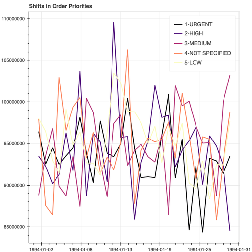 a) Line Chart: We can determine how the quantity of orders in the different order categories varies by year.