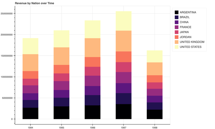 b) Bar Chart: We will plot revenue by individual countries over different years.