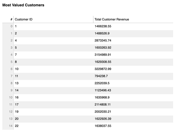 c) Data Table: We can analyze the revenue by Customer IDs and improve the readability of the graphical representation and figure out which customers provide the most income.