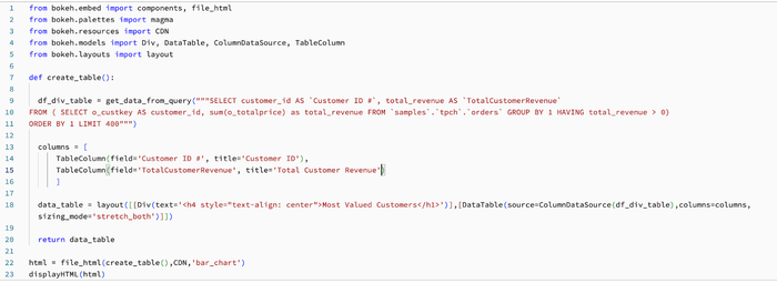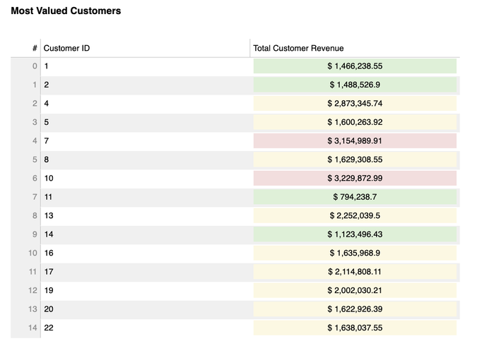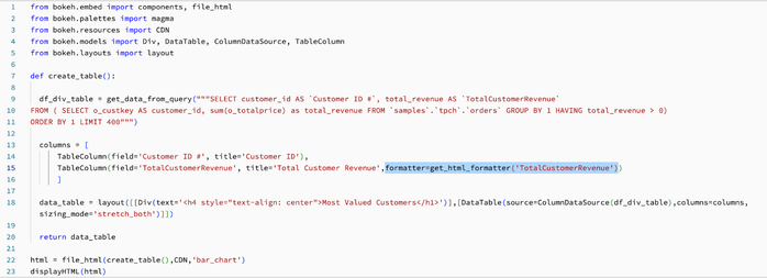 In this example let’s try to make this table a bit more beautiful by using HTML and CSS by using HTMLTemplateFormatter and adding formatter in the chart. The below code distinguishes customers based on revenue category – revenue <= $1.5M, between $1.5M – $3.0M(included) and > $3.0M: