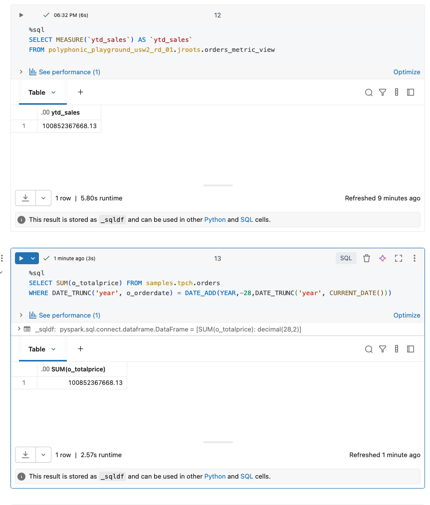 To get "YTD for the calendar year containing current_date()," you currently have to push the notion of "current year" into the query instead of the metric view definition, for example, by filtering on DATE_TRUNC('year', date) = DATE_TRUNC('year', CURRENT_DATE()). Putting CURRENT_DATE() / CURRENT_TIMESTAMP() directly in the metric view YAML makes the definition invoker-dependent, which is why materialized metric views then stop working (they canโ€™t be reused if the definition depends on evaluation time).